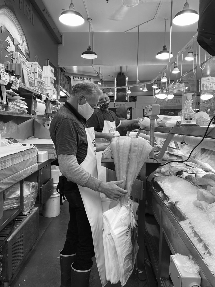 “I took immediate notice of how quickly things were changing, week to week, day to day,” she says. “Customer service now means pointing to where an item might be, filling per cup without refills, or asking the attendant for a new cup. Paying a local honey bee provider at a cash register means using a stick from eight feet away. Restaurants, grocery stores and fish markets try to cope by offering pickup or delivery. As a result, portions of their stores are now full of boxes waiting. “