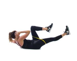 Bicycle with BandPlace a resistance band around your legs, mid-thigh. Start on your back with your hands behind your head. Keeping the low belly grounded, twist touching one elbow to the knee of the opposing leg. Switch to the other side. Repeat 10 to 12 times.