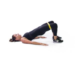 Hip Thrust with BandPlace a resistance band around your legs, mid-thigh. Start on your back with your knees bent and arms straight by your side. Driving through the heels, raise your hips up. At the top, butterfly your knees out to the side. Bring the knees back together and lower the hips. Repeat 10 to 12 times.