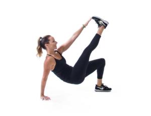 Start in a plank position. Perform a push-up, keeping the core engaged. At the top of the push up, rotate to the edges of your feet raising one arm to the ceiling. Return to plank position, perform another push up and complete the same movement on the other side. Repeat 10 to 12 times.