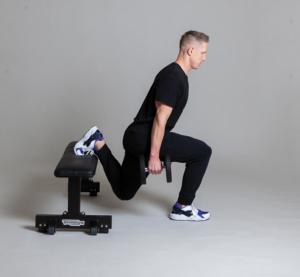 Choose a dumbbell weight you can maintain for at least 10 reps and hold it in your right hand. Stand about a foot and a half away from a bench, and place the top of the right foot on it. Squat down, driving through the left foot. Return to standing. Repeat on the other leg.